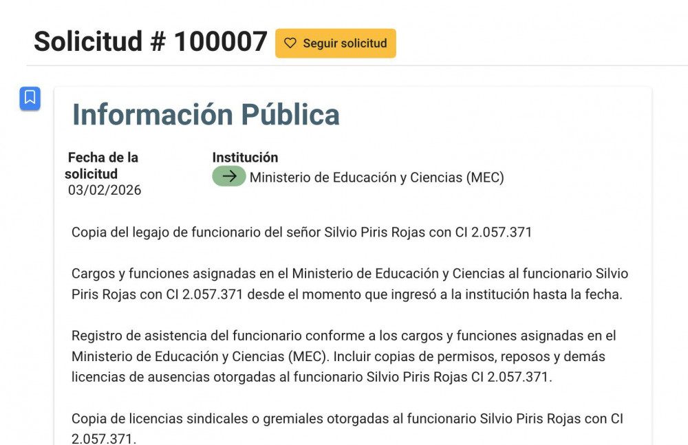 En ese contexto, la periodista de investigación Rossana Escobar, de Nación Media, presentó una solicitud formal de acceso a la información pública ante el MEC, requiriendo copia íntegra del legajo administrativo de Piris.