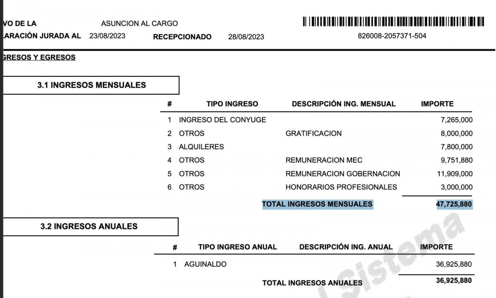 Más allá de su salario como catedrático, la situación económica de Piris se encuentra documentada en su declaración jurada presentada en 2023, cuando fue electo concejal departamental por el movimiento Colorado Añetete. Según ese documento, reportó ingresos mensuales totales de G. 47.725.880.
