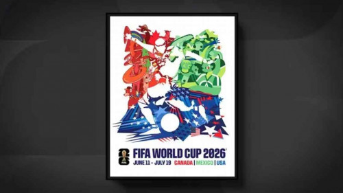 El diseño tipo collage destaca símbolos de Canadá, Estados Unidos y México, con la silueta de un futbolista como figura central del afiche conmemorativo.