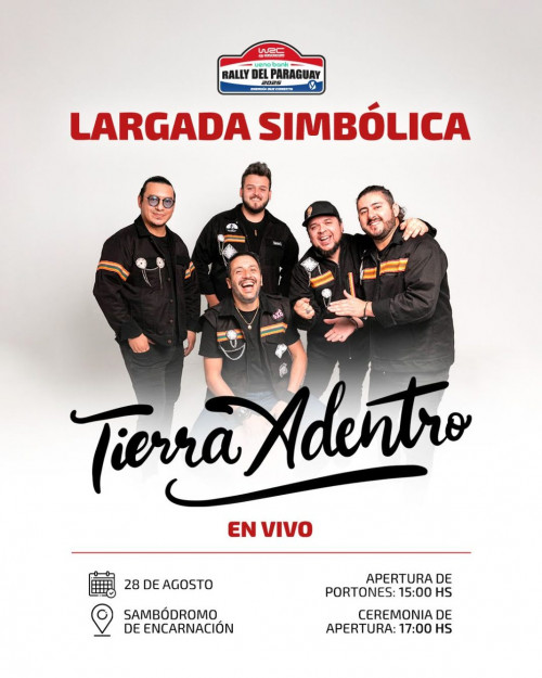 Este jueves 28 de agosto el Centro Cívico de Encarnación se viste de fiesta para la largada simbólica del Mundial de Rally, donde se presentan los equipos participantes y los shows de DJ Indio Rubio, el corso encarnaceno y el cierre de Tierra Adentro.
